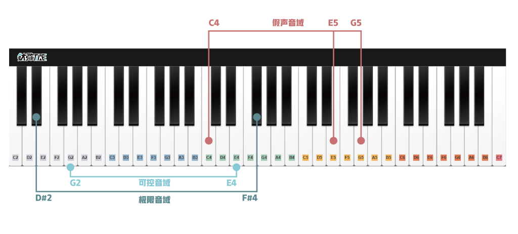 钛弥的音域如下表所示,超过音域能力的歌曲钛弥就需要降调才可以唱出来哦!